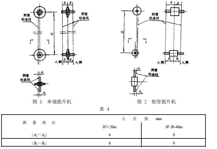 距離);上,下鏈輪(滾筒)組裝配后,用手轉(zhuǎn)動應(yīng)輕便靈活.拉緊裝置調(diào)整應(yīng)靈活,在牽引件安裝和調(diào)整好后,未被利用的行程應(yīng)不小于全行程的50%.提升機牽引膠帶接頭處徑向承載能力應(yīng)不低于膠帶徑向扯斷強度.